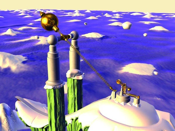 The fantastic machine, referred to as such by Halley in her intro, is the reel and catapult designed by Bing to achieve space travel[4]. At the back of the machine is a series of pulleys with a rope that attaches to the back of the sofa. In front of the area the sofa emerges from is a long slide leading down to the palm of a hand-shaped catapult, which throws the sofa into space. In the intro, however, the sofa emerges directly onto the palm of the catapult, omitting the slide until the end credits. The rope attached to the back of the sofa by a hand-shaped grasper reels Bing and Bong back to the home planet after each adventure.