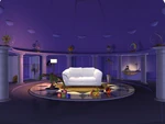 In the virtual world, only the kitchen and the living room are shown along with several empty rooms, one of which strongly resembles the living room from the unused intro. Oddly, the giant crystals and the fantastic machine are visible in the background, despite the avatar supposedly being inside the crystal cave.